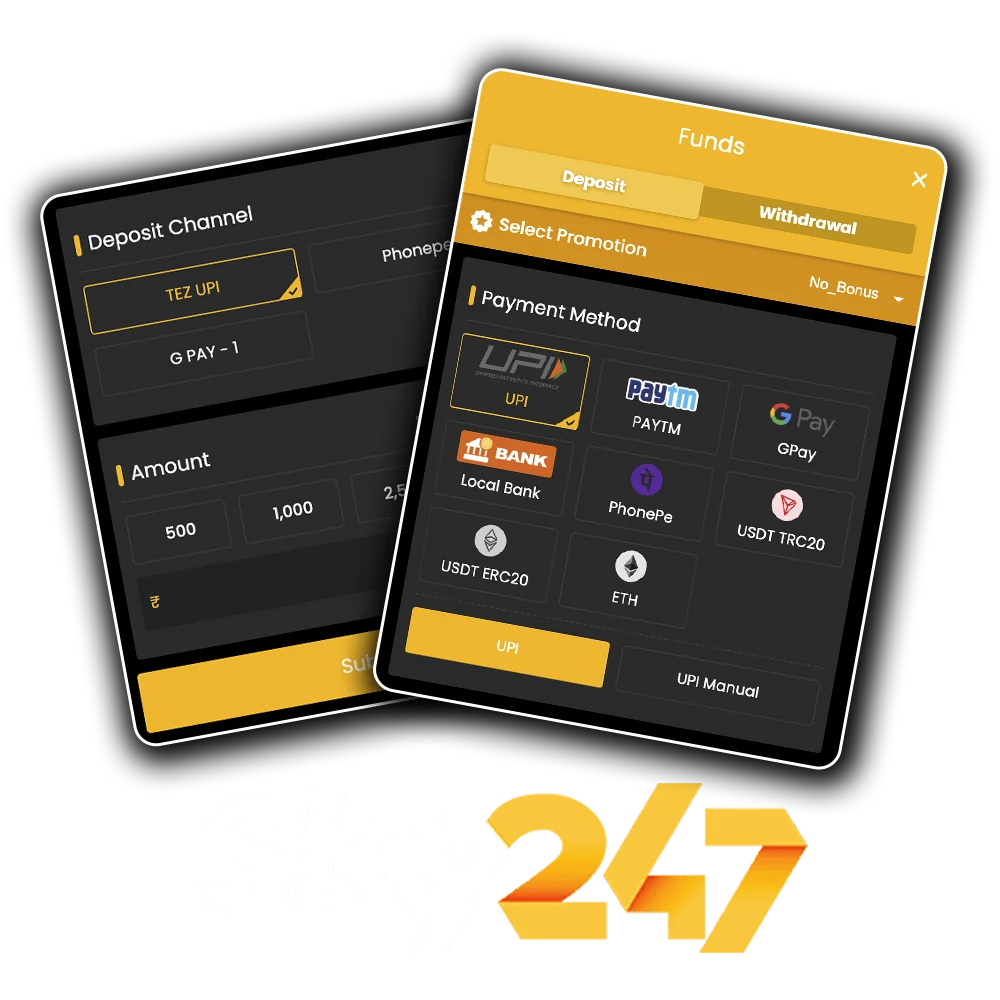 You can rely on familiar Indian payment systems for your Sky247 deposit, so you fund your account in a quick and safe way. Each method has its own benefits in terms of speed, limit and ease of use.